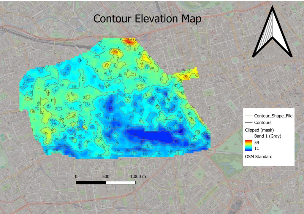 This is the first map I developed using QGIS. It is a contour elevation map of the Hyde Park neighborhood in London.